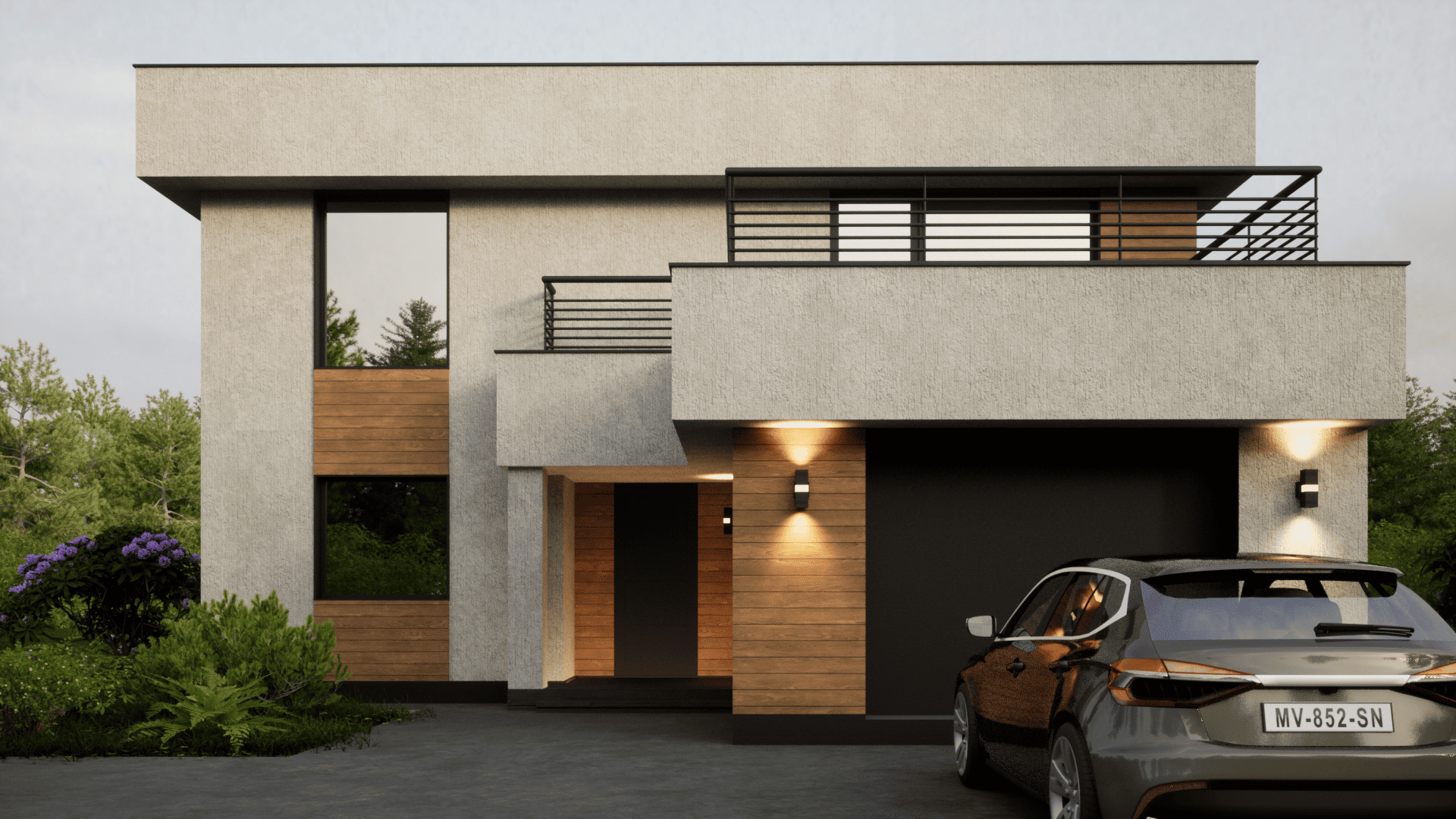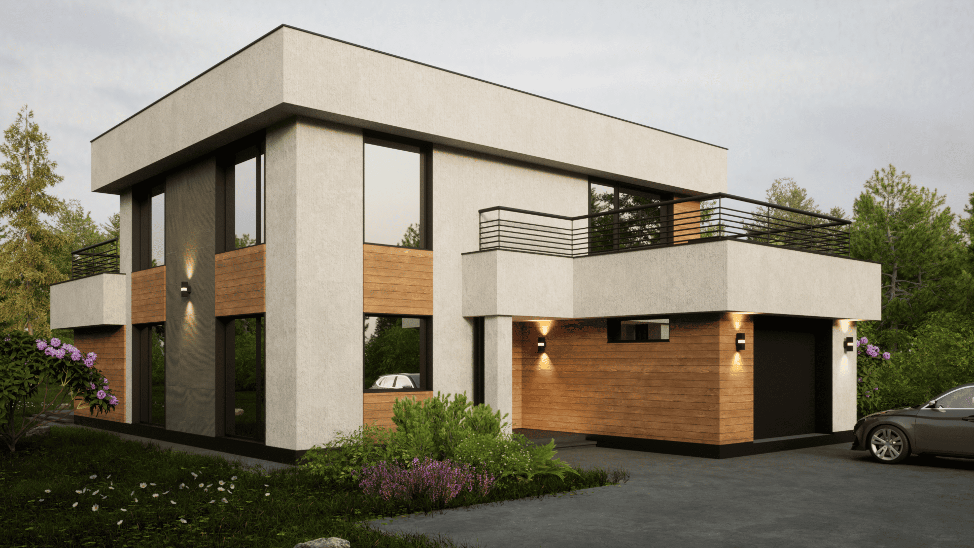 Архитектура дома построена на чистых линиях, выразительной геометрии и современном образе. Плоская крыша, лаконичные фасады и большие открытые зоны делают проект актуальным и визуально сильным.