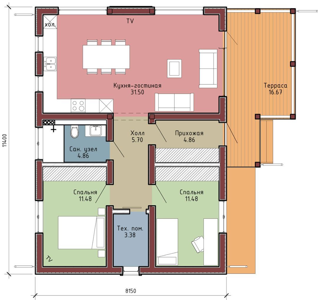 Несмотря на компактную площадь, проект П-90 даёт всё необходимое для комфортного проживания. Здесь предусмотрена общая зона для отдыха и общения, две спальни, санузел, прихожая, техническое помещение и терраса.